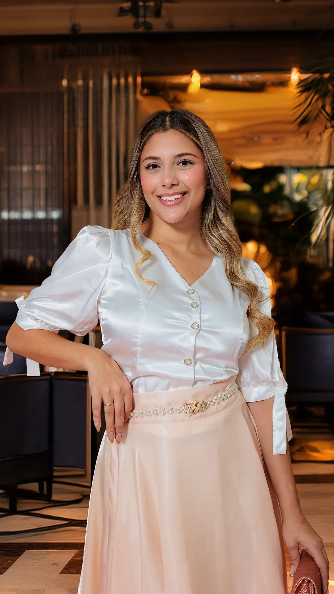 Esta blusa satinada blanca presenta una silueta holgada que asegura comodidad y libertad de movimiento a lo largo del día. Su diseño con botones delanteros añade un toque clásico y funcional, ideal para cualquier ocasión. Perfecta para quienes buscan estilo y versatilidad en una sola prenda. La modelo viste talla 8, facilitando la elección de tu talla ideal.