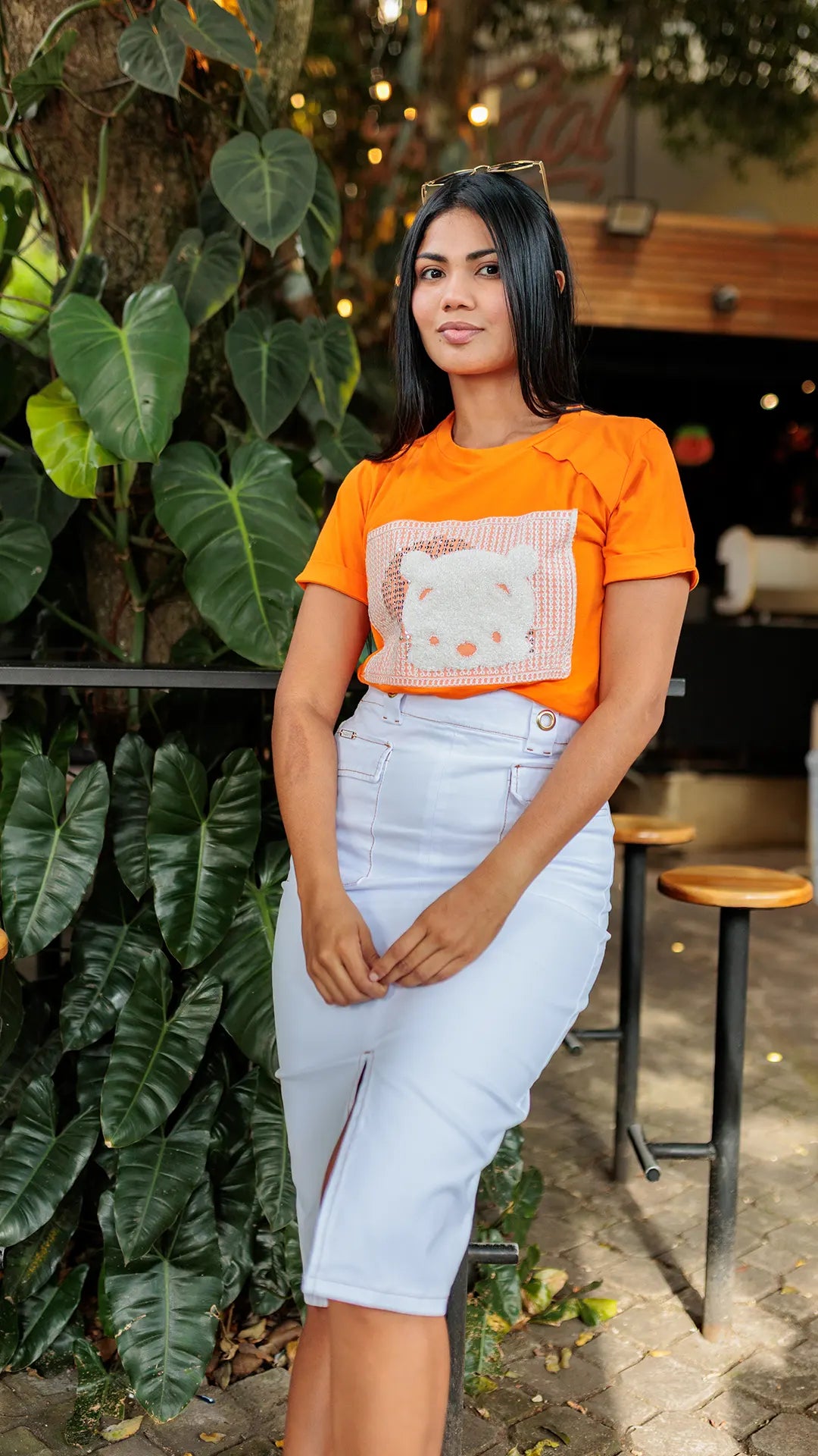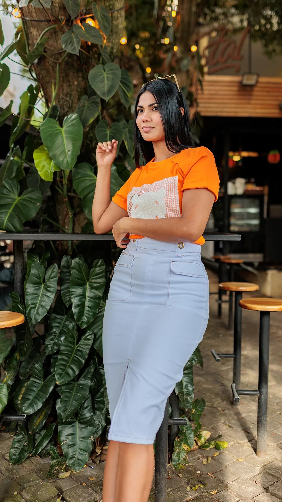 Esta falda de dril 3/4 combina un diseño de silueta ajustada con un cierre en la espalda para un ajuste cómodo y seguro. Su color blanco ofrece versatilidad para múltiples estilos, ideal para destacar en cualquier ocasión. La modelo viste talla 8, ayudándote a visualizar su ajuste perfecto. Una prenda que realza tu figura con elegancia y comodidad.