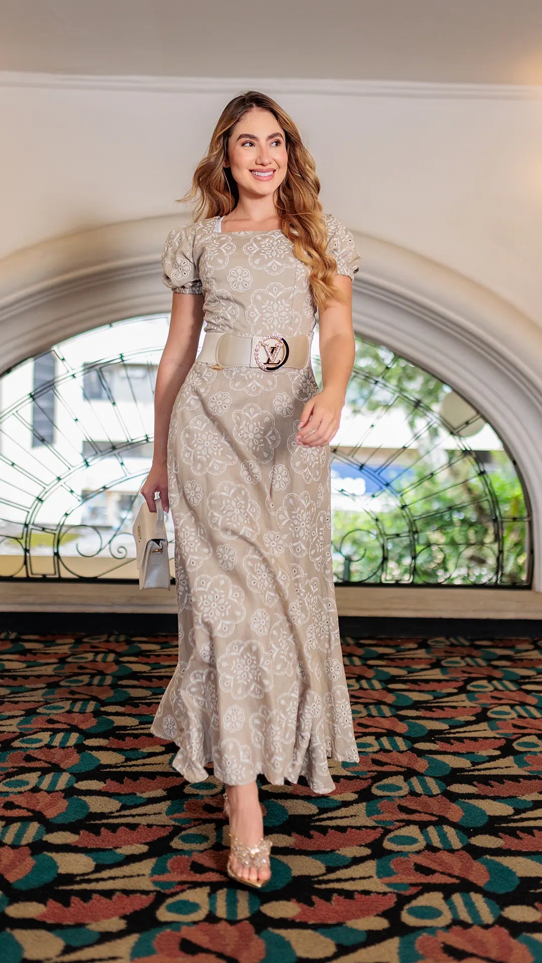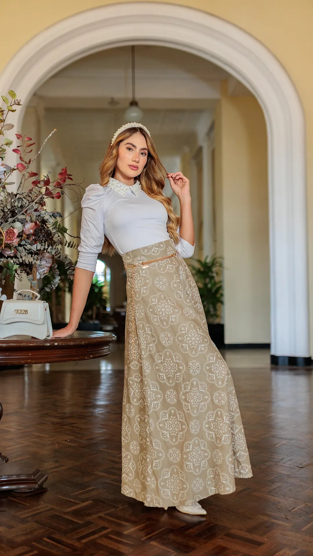 Falda larga rotonda con silueta semi-ajustada que realza tu figura de manera elegante y cómoda. Diseño versátil en color arena que combina con cualquier estilo, perfecto para ocasiones especiales o uso diario. Cierre lateral práctico que facilita el ajuste perfecto. La modelo viste talla 8, ideal como referencia para encontrar tu talla ideal. Una prenda esencial que te hará sentir segura y hermosa en cada paso.