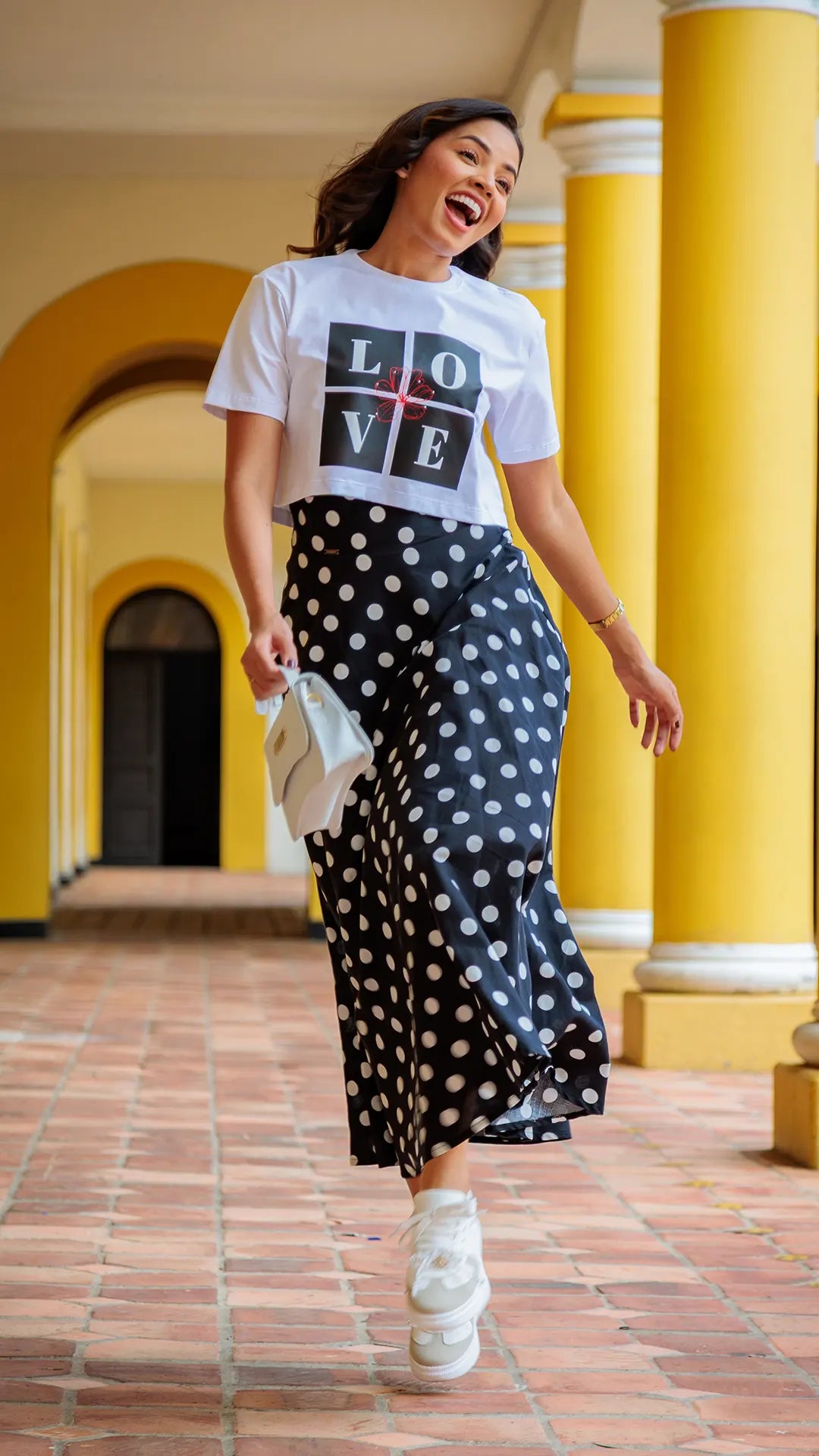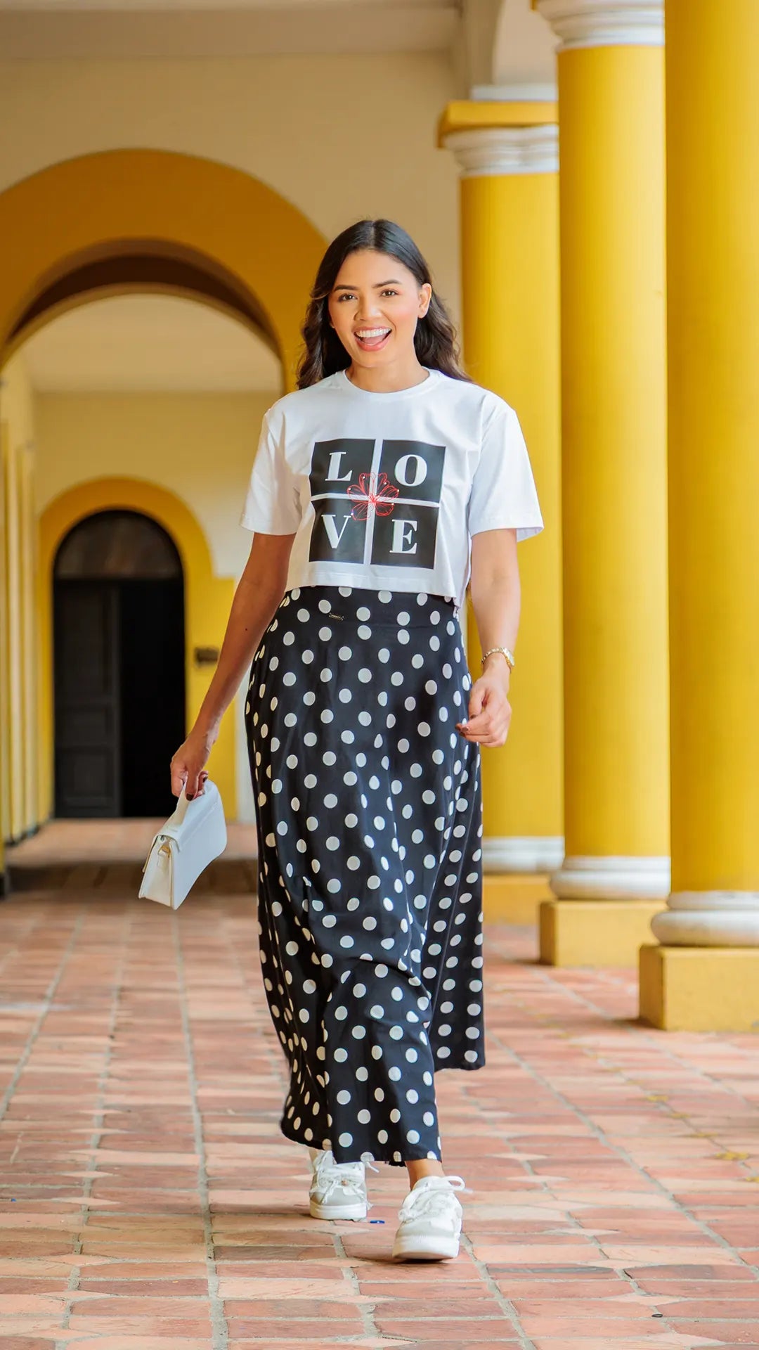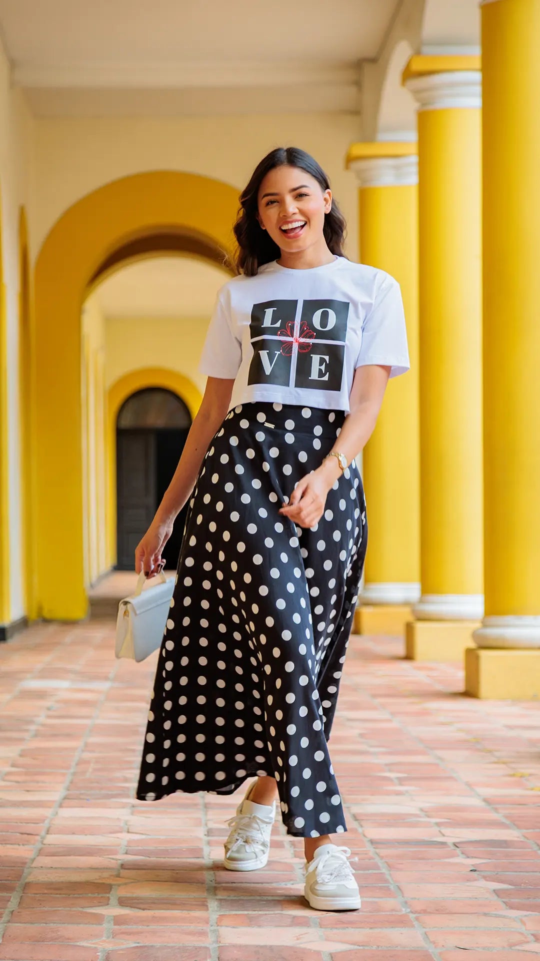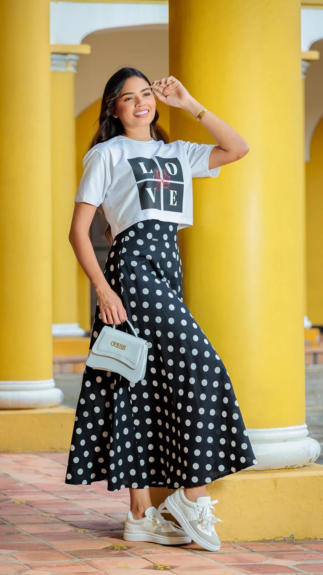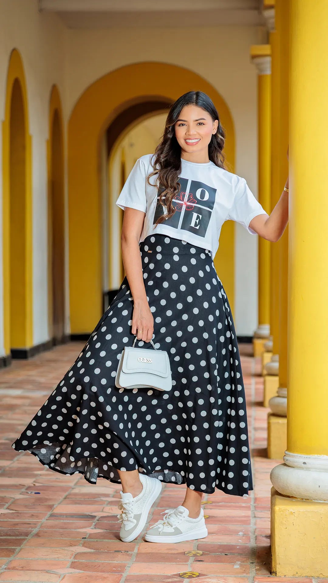 Esta falda larga negra ofrece una silueta holgada que combina comodidad y estilo. Su cierre lateral facilita el ajuste perfecto y aporta un toque sofisticado. Ideal para cualquier ocasión, este diseño elegante se adapta a tu figura con facilidad. La modelo luce talla 8 para darte una referencia precisa de su caída y tamaño. Añade esta pieza versátil y chic a tu guardarropa.