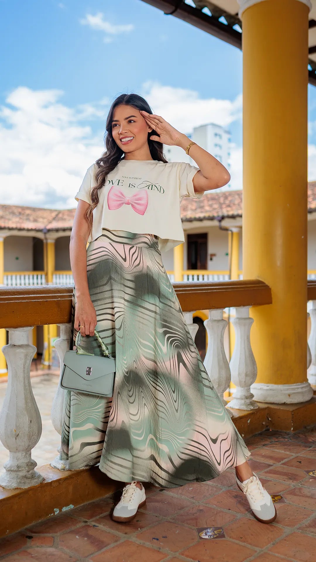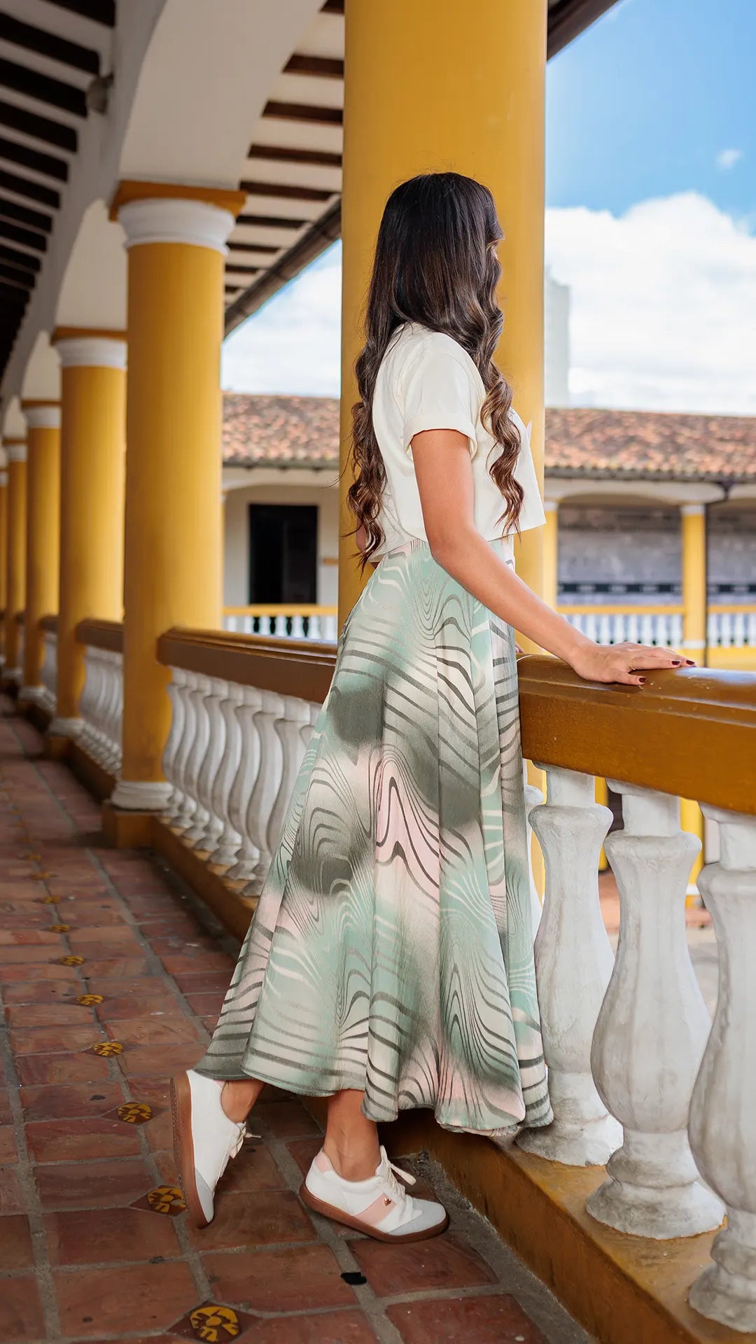Esta falda larga de silueta semi-ajustada realza la figura con un delicado encaje en la cintura, aportando un toque elegante y femenino. Su color estampado añade vitalidad y estilo a cualquier look, perfecta para ocasiones donde deseas destacar con sofisticación y comodidad. La modelo luce una talla 8, asegurando un ajuste ideal para diversas siluetas. Atrévete a combinar esta pieza única que resalta tu personalidad con un diseño que no pasa desapercibido.