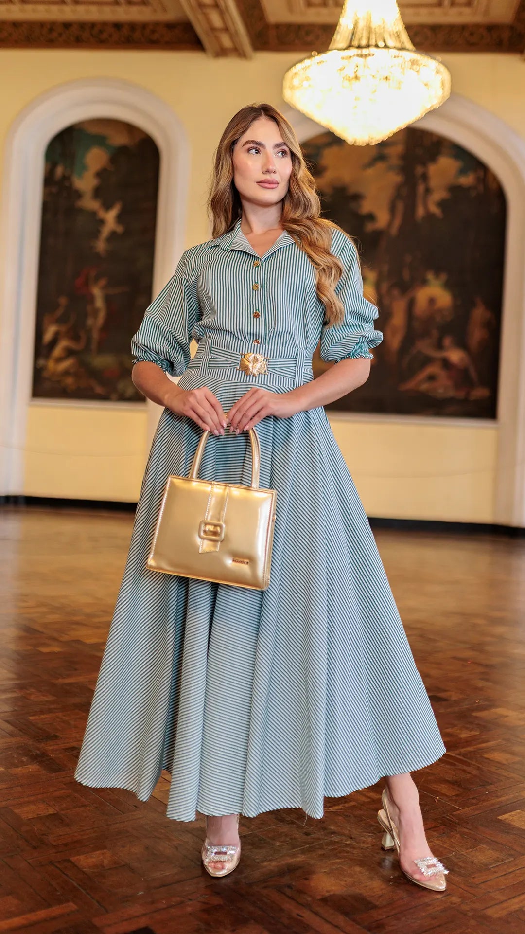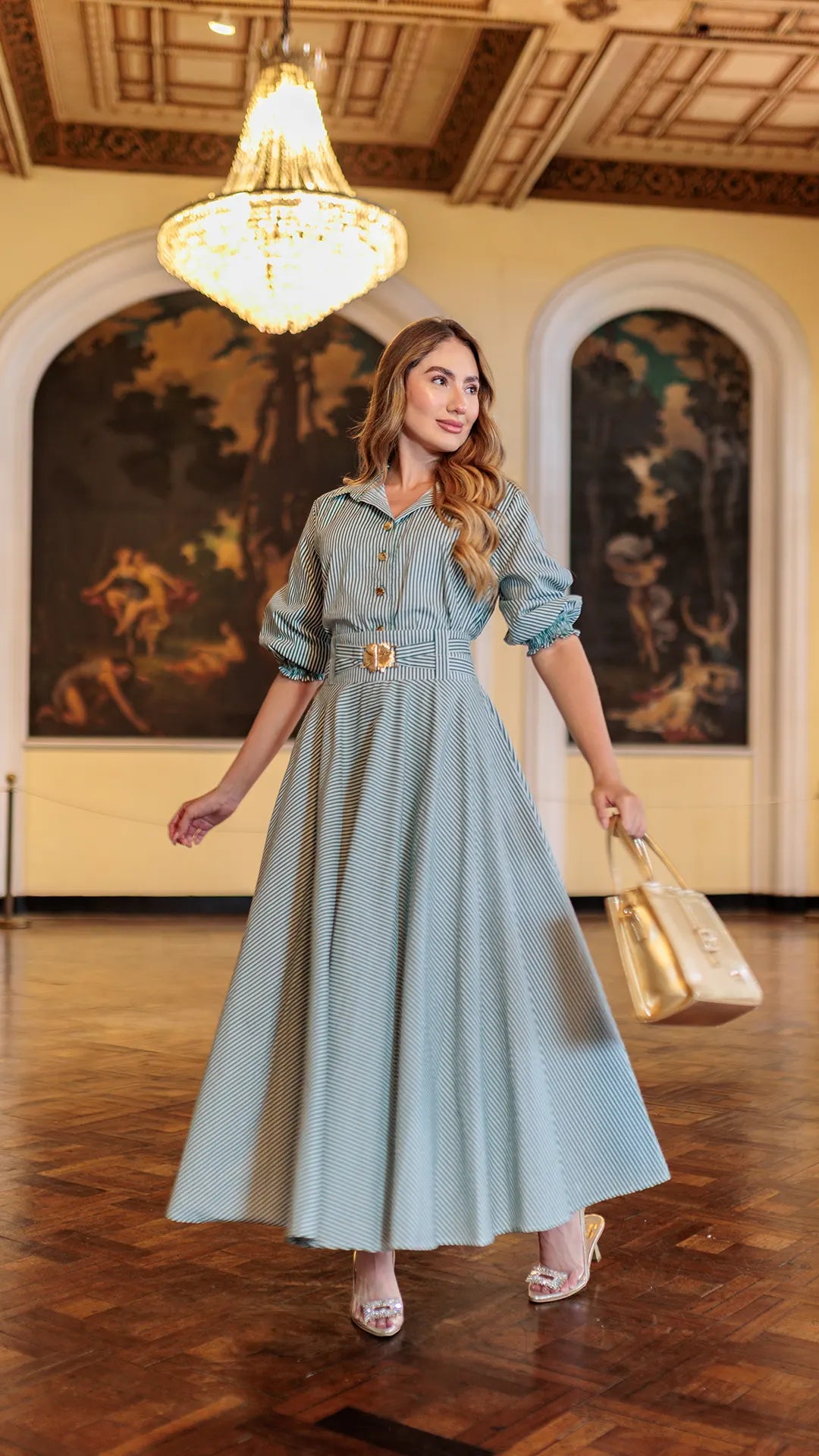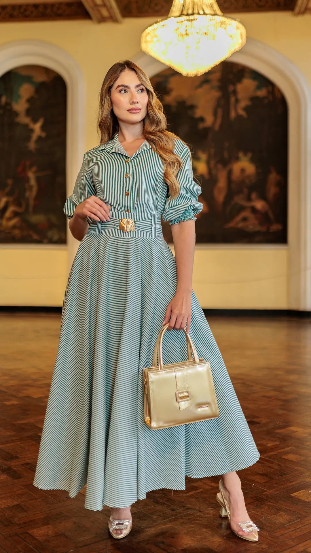 Falda larga rotonda con silueta holgada que proporciona comodidad y movimiento sin sacrificar el estilo. Diseño versátil en tonos verde con rayas que se adapta a cualquier ocasión, desde lo casual hasta lo más elegante. Cuenta con hebilla ajustable en la cintura para un fit personalizado. La modelo viste talla 8, permitiéndote visualizar cómo lucirá en ti. Perfecta para quienes buscan prendas que combinen libertad de movimiento con un look sofisticado y moderno.
