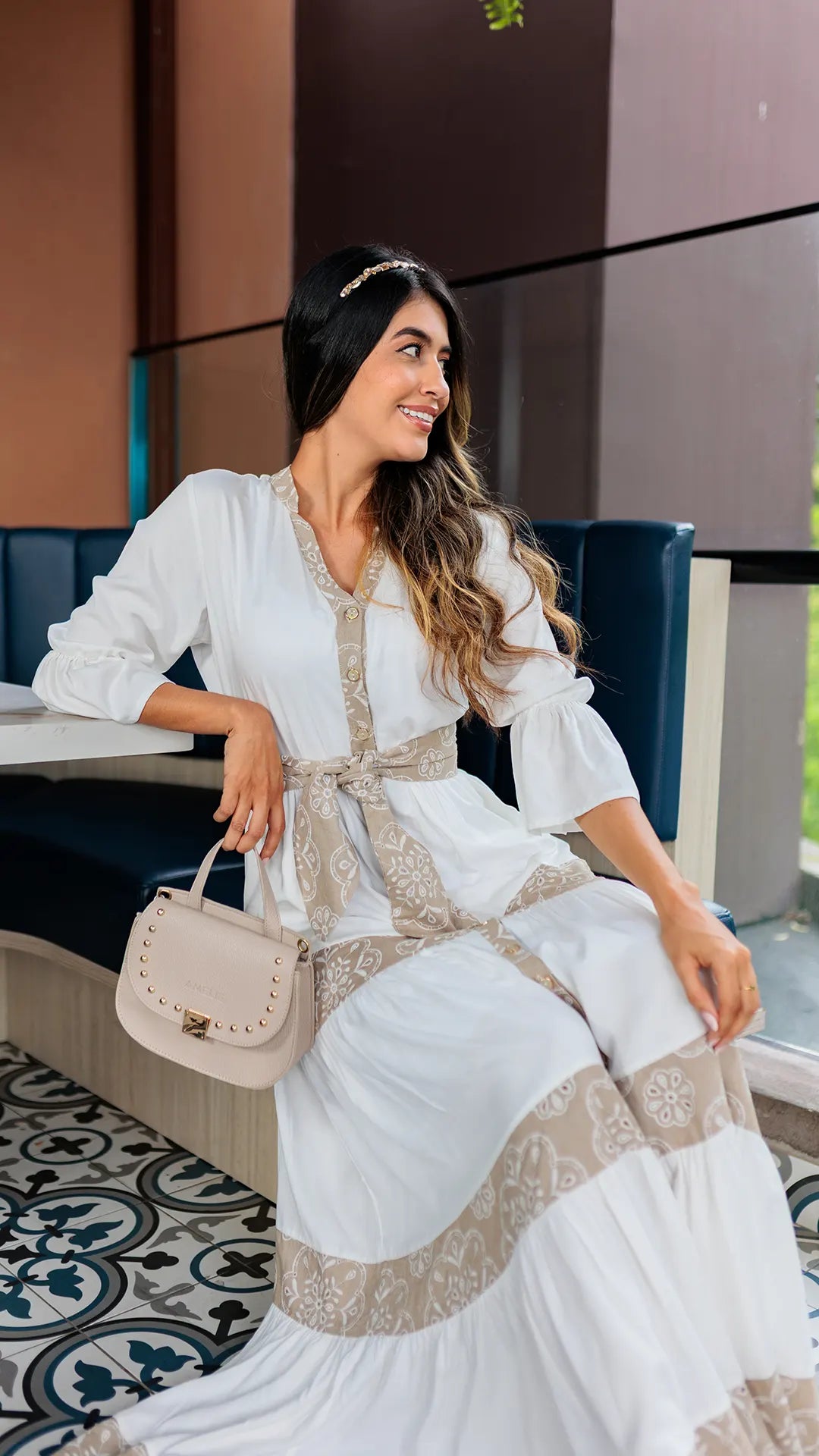 Vestido largo en lino con una silueta semi-ajustada que favorece la figura sin comprometer la comodidad. Diseño elegante con botones funcionales en el delantero que añaden detalle y practicidad. Confeccionado en tonos neutros blanco y beige, perfectos para crear looks versátiles desde el día hasta la noche. La modelo viste talla 8, ideal para referencias de ajuste. Una pieza esencial que combina sofisticación natural con la frescura del lino, garantizando estilo y transpirabilidad en cualquier ocasión.