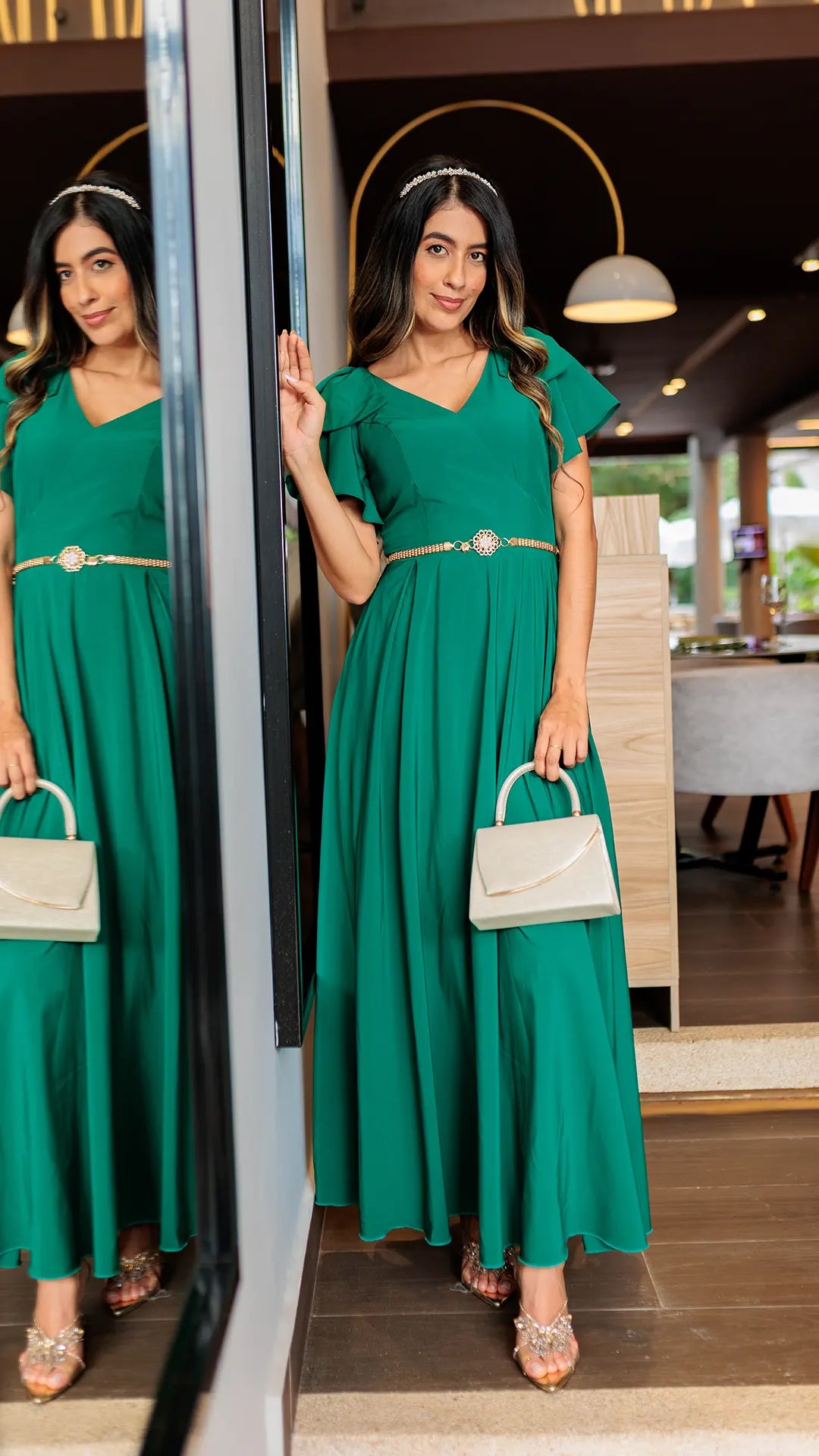 Elegancia sofisticada en cada detalle. Este vestido largo presenta una silueta semi-ajustada que realza tu figura con estilo, complementado por corbatas en los hombros que añaden un toque de distinción. El cierre en la espalda proporciona comodidad y facilidad al ponértelo. En un hermoso verde pino que transmite serenidad y clase, es la opción perfecta para eventos especiales, cenas elegantes o cualquier ocasión donde desees lucir radiante. La modelo viste talla 8, permitiéndote visualizar cómo se adapta el diseño. Un vestido que combina confort y sofisticación para que te sientas segura y hermosa.