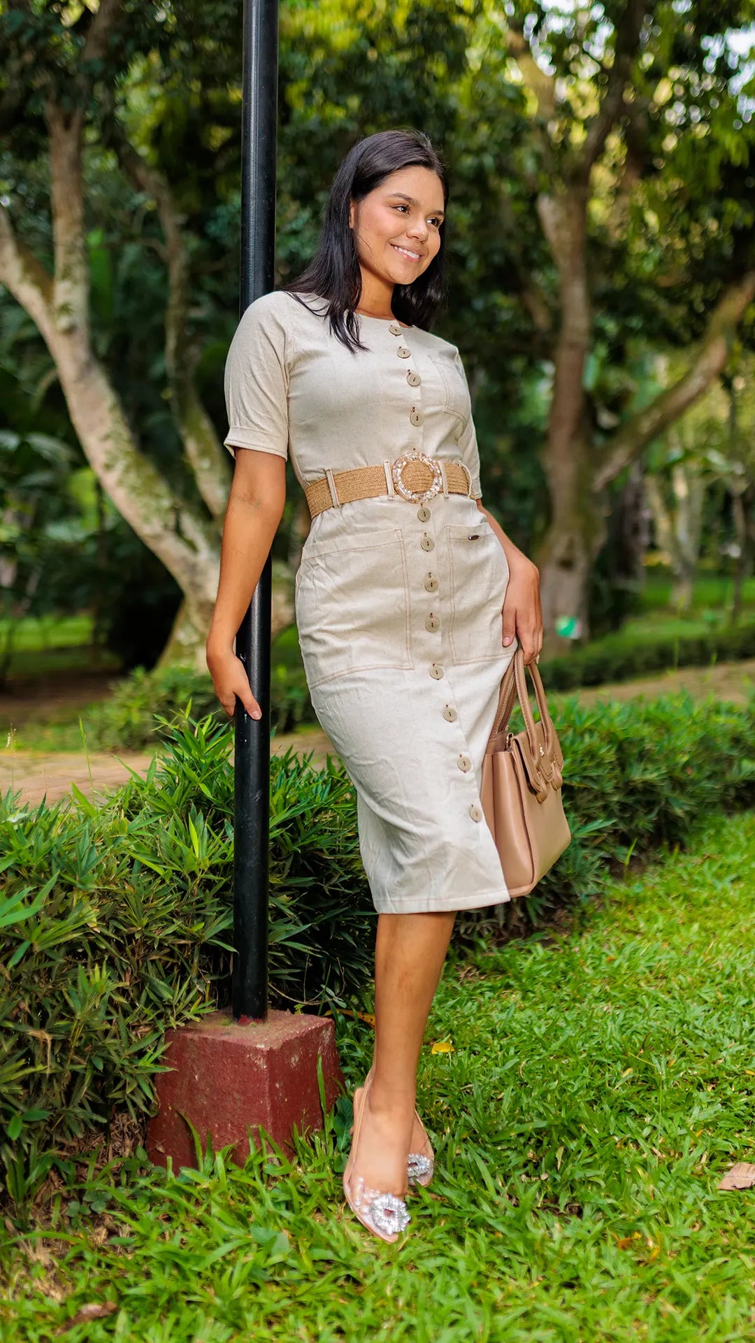 Este vestido 3/4 en color beige ofrece una silueta semi-ajustada que realza tu figura con elegancia y comodidad. Su diseño con botones delanteros añade un toque clásico y versátil, ideal para diversas ocasiones. La modelo luce una talla 8, facilitando la elección de tu talla perfecta. Perfecto para quienes buscan estilo y sofisticación en una prenda ligera y fresca.