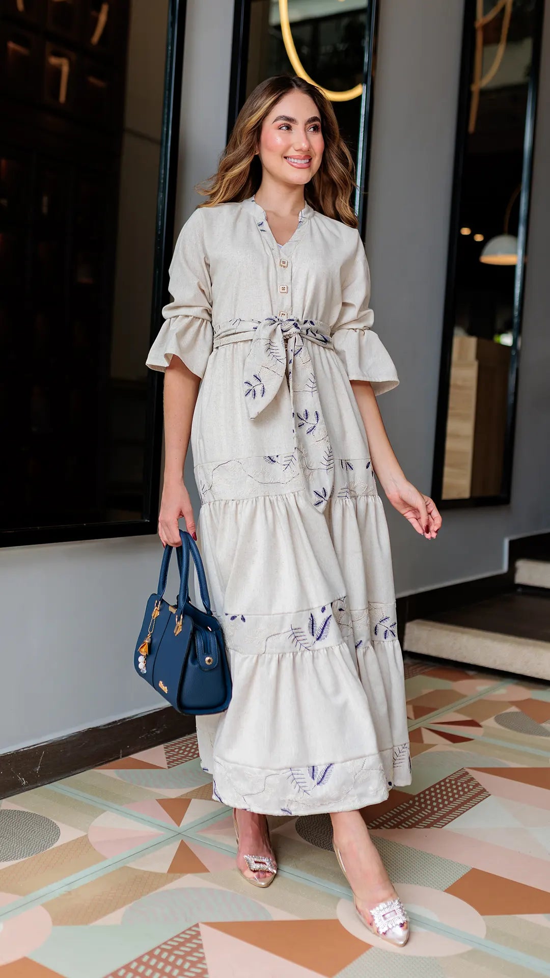 Vestido largo en lino con silueta semi-ajustada que realza tu figura de manera elegante y cómoda. Diseño versátil con botones frontales que añaden un toque sofisticado y funcional. Su tono beige neutro combina con cualquier estilo, perfecto para ocasiones especiales o uso diario. Confeccionado en lino de calidad, garantiza transpirabilidad y durabilidad. La modelo viste talla 8, ideal como referencia para encontrar tu ajuste perfecto. Un básico imprescindible que trasciende tendencias.
